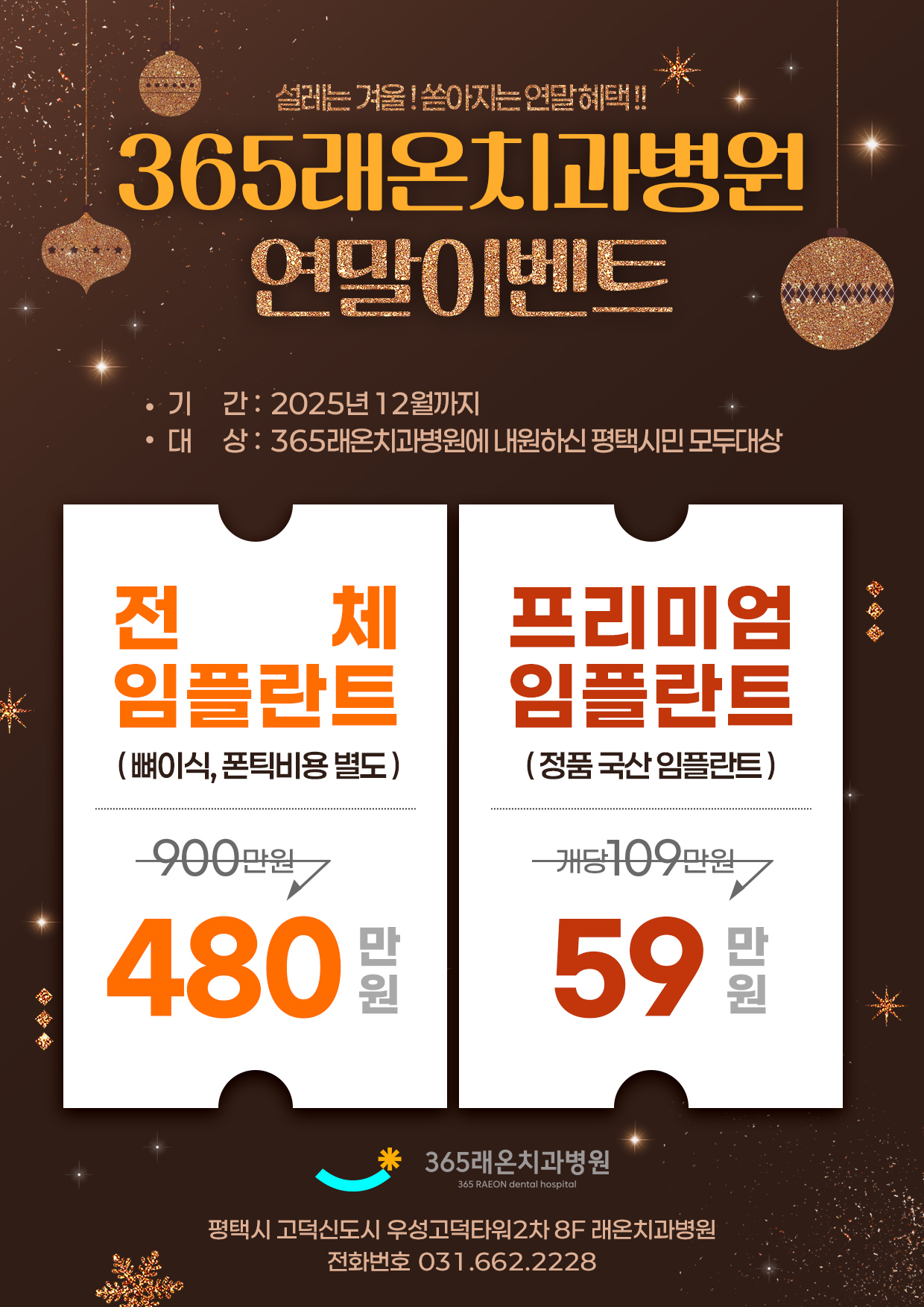 * 전체 장비 : (오토클레이브, 플라즈마소독기, 3D-CT, 수면마취 장비, 1인 가족회복실, 체어정수시스템, 오토클레이브소독정수시스템, 미세현미경, 포터블엑스레이, 구강카메라, 컴퓨터무통마취기, 방사선보호장비, 구조대장비, 제세동기, 혈압계, 혈당측정기)
